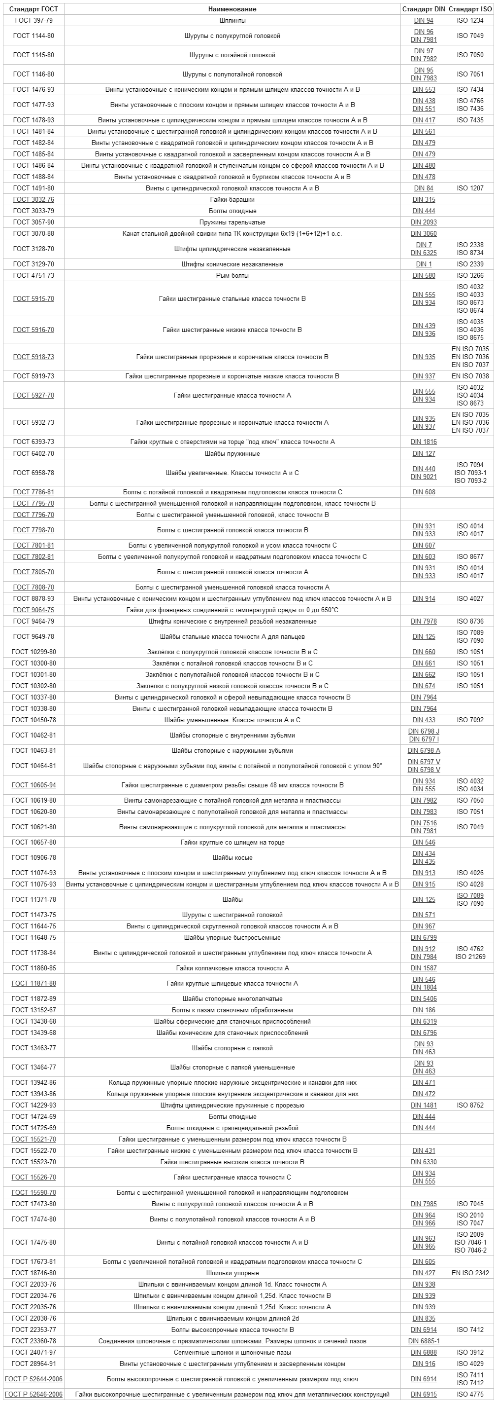 Таблица соответствия стандартов (ГОСТ, DIN, ISO)
